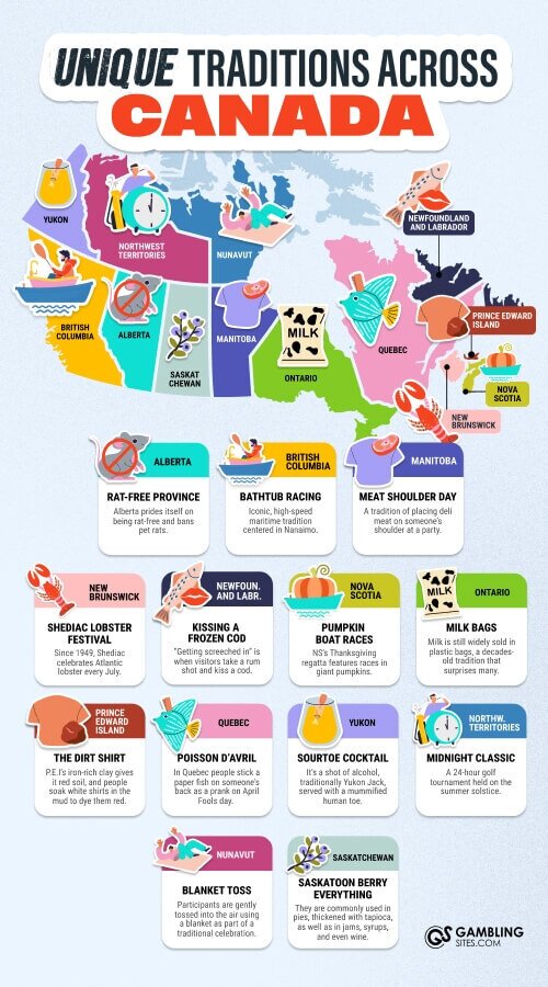 Infographic titled “Unique Traditions Across Canada” showing a Canadian map with province-by-province tradition callouts.