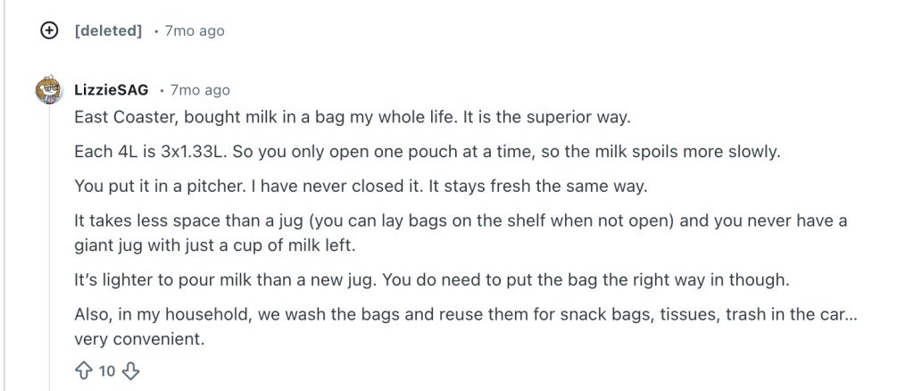 Reddit user LizzieSag steps in to defend Canada’s bagged milk tradition, answering the question many outsiders ask: why bags, and what’s it actually like to use them day to day?